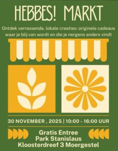 Op zondag 30 november 2025 verandert Park Stanislaus in Moergestel in een gezellige plek vol creativiteit, vakmanschap en sfeer. Tijdens de Hebbes! Markt ontdek je verrassende, lokale creaties: originele cadeaus,